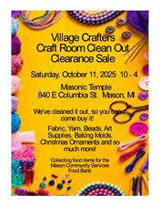 517-896-7281 If only it was just a closet! PLEASE join us as we clean out those craft rooms and bring our supplies to you! JoAnn's may have sadly closed their doors, but we will be open for business! Once again, we will have a room full of artists and crafters selling their no longer needed items at rock bottom prices! Come out, grab a complimentary refreshment and shop! Art supplies...Fabric...Paper Crafts...Yarn...Baking Molds...Mesh... Christmas Ornaments and so much more! Collecting items for the Mason Community Services Food Bank